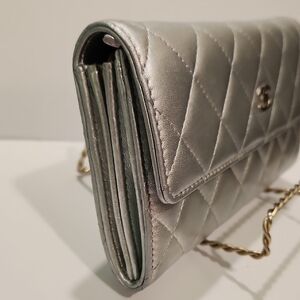 This exquisite Chanel clutch in metallic silver showcases the brand's signature diamond quilting and luxurious lambskin leather. The elegant design is completed with a prominent CC logo in matching metallic hardware, making it a timeless accessory for any occasion. Includes dust cover and box. Also will include aftermarket silvertone chain to wear as wallet on chain. Gently used condition with some darkening in the coin zipper pocket. Slight scratches on hardware. Halogram in tact.