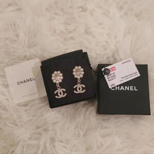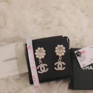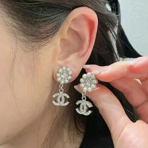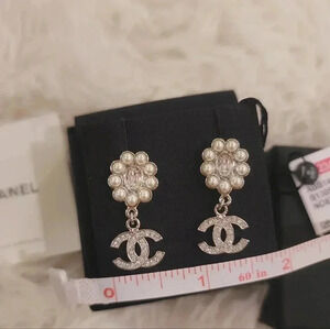 Chanel Silver Pearl Crystal CC Dangling Earrings