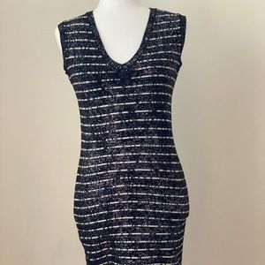 Chanel Wool and Cashmere dress in great condition . Black and creme Chanel metalic wool striped sleeveless dress featuring rib knit trim throughout , V neck and interlocking CC bow embellishment at front . Chanel size EU 36 Please check and zoom the photos for more details .