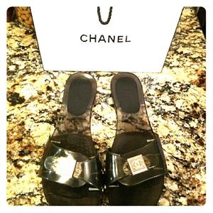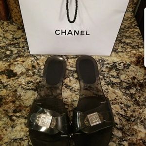 Very comfortable gray Chanel slides for the Summer. Chanel jelly logo on the strap. In great condition, no scuff, rip or tears. Worn a few times. Adjustable foot strap for additional comfort. Size 9.5.