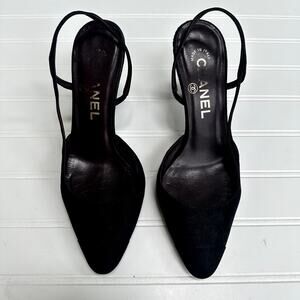 Chanel Slingback Heels Suede Cap Toe Black Gold Emblem CC Heel 36.5