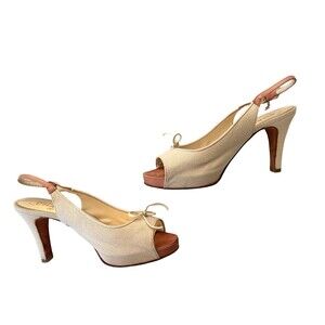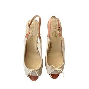 Chanel Slingback Peep-Toe Heels Beige Canvas Leather Bow Detail Size 38.5