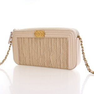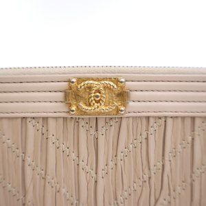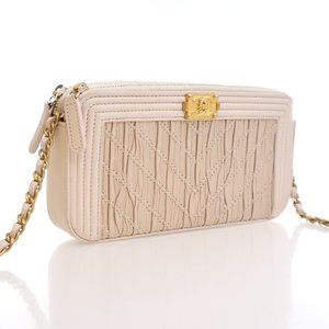Chanel Small Beige Crumpled Lambskin Boy Clutch With Chain