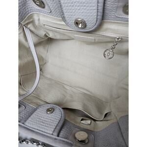 Features: Silver hardware, dual leather handles, interior zip pocket, snap closure.