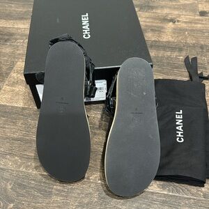 Elevate your look with these authentic CHANEL sandals in the sought-after So Black finish. Crafted from smooth black lambskin leather, they feature black leather-threaded chain straps, rubber soles for comfort, and subtle black CC logos on the insoles for that signature Chanel touch.
