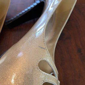 Platform heel with sparkle and a cap toe. Swipe to see wear on patent leather