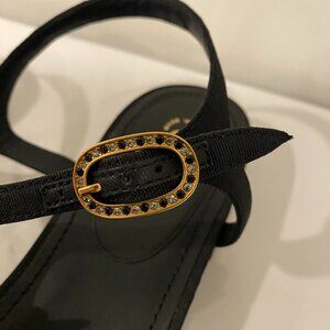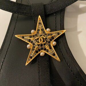 Shine in these made in Italy Chanel star sandals! These black thong style shoes feature a bedazzled star that prominently features the Chanel logo. Buckles feature beautiful black gems. Great condition, other than some wear on the bottom of the shoes. Size 36C, the American equivalent of a 6 wide. Comes with The Real Real dust bag.