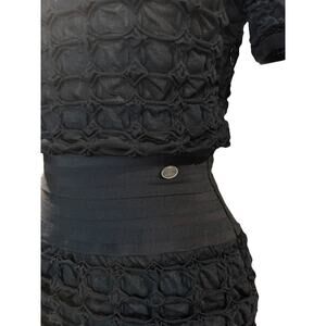 Flaunt your curves with the iconic brand Chanel's Stretch Mini Dress. This modern LBD with a textured ruffle adds a touch of flair to its sexy and classy design. The stretch fabric, short sleeves, and waist band ensure both comfort and style. A timeless and stylish addition to any wardrobe.