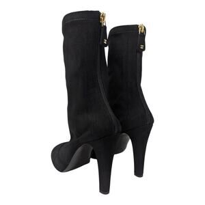 Keywords: Chanel, stretch, suede, ankle boots, booties, black, designer, luxury, authentic, stiletto heel, high heel, sock boots, back zipper, women's shoes, elegant, fall, winter.