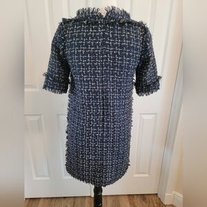 Excellent pre owned condition unbranded made in NYC size 2 Chanel style shift dress in navy and gold tweed with fringe details and button accents. Perfect for a sophisticated look. Unfortunately the tag was removed from this dress when it came into my possession. Couldn't pass up something so timeless and beautiful.
