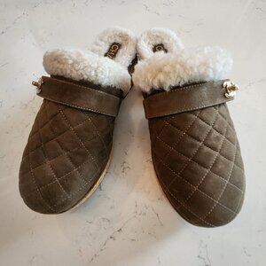 Chanel Suede Calfskin Shearling Turn Lock Clogs, Authentic