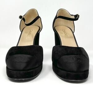 These Chanel Mary Jane pumps are equal parts elegance and edge. Crafted in rich black suede with satin cap toes, they feature a chunky block heel and an open D’Orsay silhouette that offers both vintage charm and modern structure. Finished with a delicate ankle strap and the stitched CC logo at the toe, this is a versatile collector-worthy design that transitions seamlessly from desk to dinner—and every moment in between.