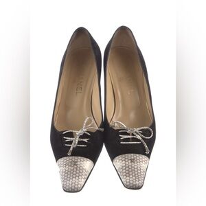 Chanel Suede Kitten Heel Pumps Snakeskin Cap Toe CC Logo Bow Vintage Mules 39 9