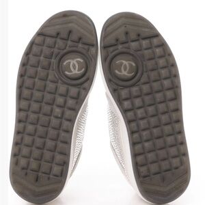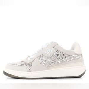 Elegant CHANEL sneakers with rhinestone accents. Iconic logo on the side. Stylish and chic.