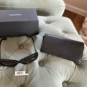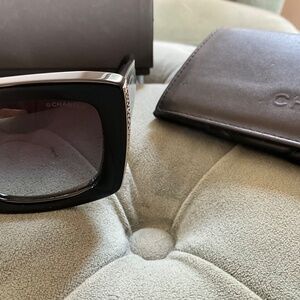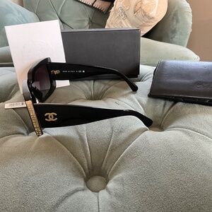 Beautiful, authentic black and gold Chanel sunglasses. Comes with box, case, eye glass cloth and original receipt. Used only once or twice. Happy Shopping!