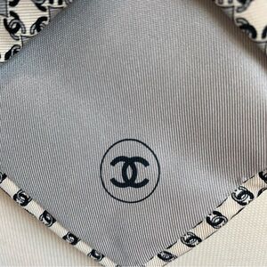 Eggshell Chanel Tie with Black and Silver CC throughout. See pic for width