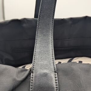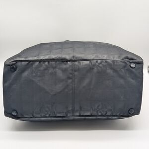 Authentic Chanel Travel Line tote in black jacquard nylon with tonal leather handles and silver-tone hardware. Subtle CC logo grid pattern throughout. Zip-top closure with spacious interior and zip pocket.