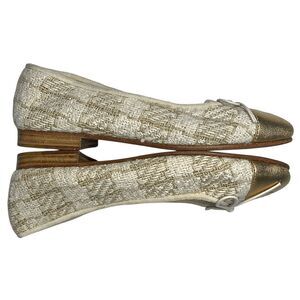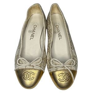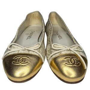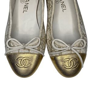Chanel Tweed & Gold Cap Toe Ballet Flats 37C Classic Logo Flats Interlocking C