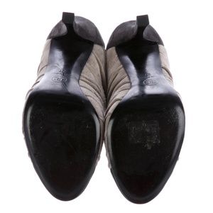Size: 7 | IT 37 Charcoal and taupe suede Chanel round-toe booties with cap toes, ruched details featuring silver-tone camellia adornments at uppers, covered heels and zip closure at counters. Heels: 4.25”