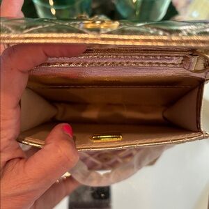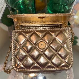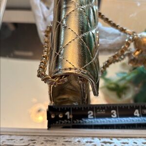 New authentic VIP GWP gift. The material is vegan leather. Has an adjustable chain with CC ball logo. This bag is very small and your phone will not fit if you are not familiar with VIP gifts please do not purchase. The color is GOLD. There is a clear tag inside that says compliments of Chanel