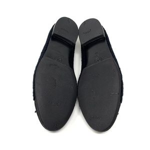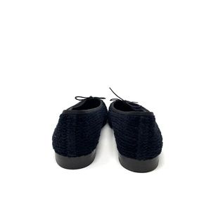 Black velour Chanel round-toe flats with embossed leather cap-toes featuring CC, bow accent at tops, grosgrain trim and stacked heels. Visit the website in our bio to learn more.