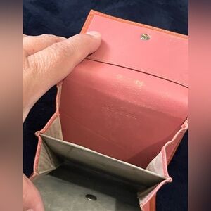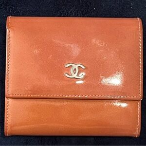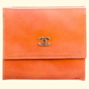 This luxurious Vintage Chanel wallet in a vibrant orange hue showcases the brand's signature CC logo, offering a sleek and polished finish. Its structured design and minimal detailing make it a timeless accessory, perfect for adding a touch of elegance to any ensemble.