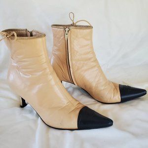 Authentic vintage Chanel Booties with dust bag and original box. Cream leather, black pointed toe with logo. Very little signs of wear - some creasing in the leather, minor scuffs on toe tips, no scratches. 2.5" kitten heel. Fit sizes 7-7.5 best, a bit narrow but very soft and comfortable. Original price is an estimate, as they are a vintage item. GREAT CONDITION!