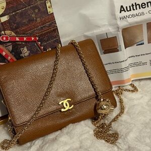 Caviar leather vintage Chanel Wallet On Chain with brushed gold-tone hardware, single chain-link and leather shoulder strap, single zip pocket at back, tonal leather and woven interior lining, single zip pocket at front flap underside, single slit pocket under front flap, dual compartments; one with zip closure, single slit pocket at, six card slots at interior wall and CC flip-lock closure.