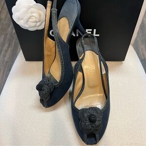 The most darling black slingback peep toe heels from iconic fashion house Chanel. Features the iconic Chanel "CC" logo on a camelia raffia flower accent. These shoes are a timeless statement accessory and are perfect for the designer collector. So chic!