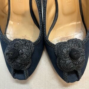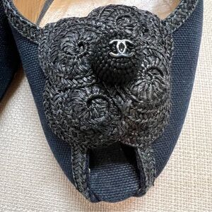 Chanel Vintage CC Logo Black Slingback Camelia Raffia Heels Peep Toe Sandals 8