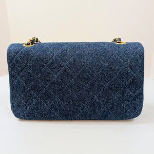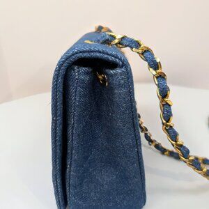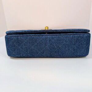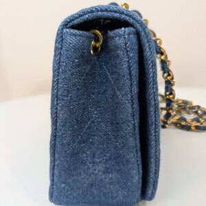 This striking Chanel bag is a unicorn--a very rare vintage single full-flap, crafted from dark blue quilted denim, offering a unique, casual interpretation of the iconic design. There were very few denim bags made during the vintage years this bag was produced (1996-1999). It does have 24k gold plating on all hardware. The bag has a structured, rectangular silhouette with a single full flap that secures with a CC turn-lock. The full quilted flap distinguishes this vintage denim bag from others that came later in the Chanel line. The versatile strap is a brushed gold chain threaded with blue denim; it allows comfortable shoulder or crossbody carry. The chain may be folded inside to use the bag as a clutch. The interior is lined with black leather, with the typical 3 inside slip pockets—one for lipstick, as well as a zip pocket. It is in excellent preowned condition, with minimal signs of corner rubbing and slight wear of chain metal in strap. This vintage Chanel handbag comes with its original vintage dust bag as well as a Chanel box. It contains the store sale stamp inside the zip pocket.