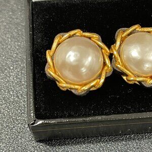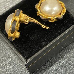 Gorgeous vintage Chanel small round earrings. Gold metal fram with interwoven leather and dhain around the faux pearl. Clip on earrings. Made in France' oval hallark on the reverse of the earring. Diameter: 17 mm. As with any preloved item, there may be signs of wear and use. Please look carefully at photos.