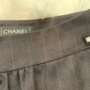 Authentic Brown Chanel vintage knee-length wool skirt with interlocking CC logo at waist, slit pockets at side and concealed zip closure at back. From the Fall 2001 Collection by Karl Langerfeld.