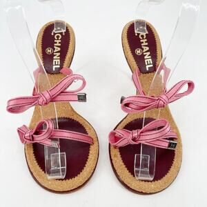 Chanel Vintage Pink Satin Bow Cork Sole Slide Sandal Heels EU 38