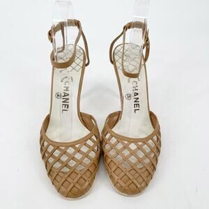 Chanel Vintage Retro Camel Tan Leather Woven Lattice Ankle Strap Heels EU 38
