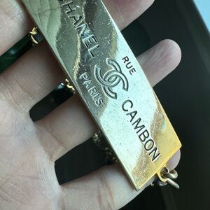 Vintage Chanel from the 90s. Moderate signs of wear throughout. Scratches and light fading on the metal. The chain is fabric material.