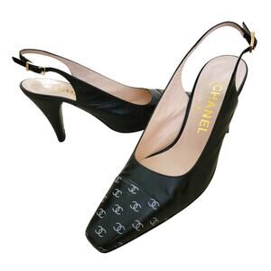 Chanel Vintage Square Toe Slingback Black CC Logo Leather Pumps Heels 6 36.5