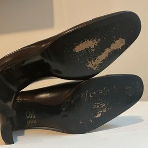 Rare vintage Chanel block heel with two tone black and brown leather. Body of shoe is brown and it has a rounded square cap toe in black featuring the CC logo. Some scuffs on sides of leather. Soles worn with scratches. Good condition interior. Very light creasing. No box or dust bags