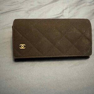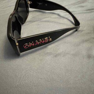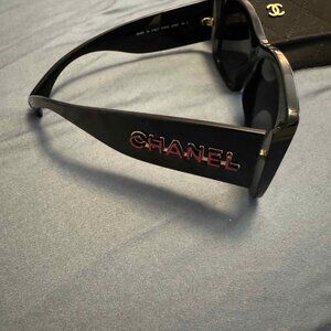 This is a pair of authentic Chanel Acetate Sunglasses, style 71473A in black. These are in excellent condition, no scratches on lenses. Square frame with elongated squared rims featuring a blue CC logo and black lenses. Arms have a raised gold and pink Chanel Logo.