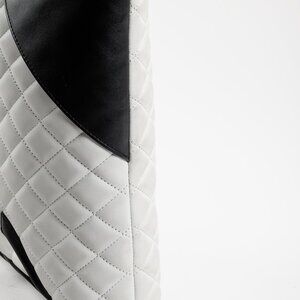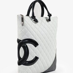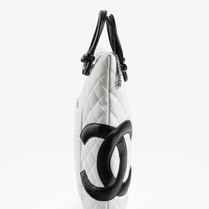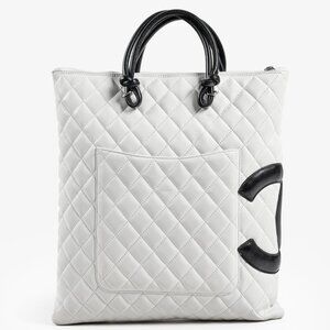 The Quilted Medium Cambon Tote by Chanel, crafted from diamond quilted calfskin leather in white with smooth black leather trim. Featuring a large black CC logo on the front and black knotted shoulder straps with one exterior patch pocket in matching calfskin. The zipper closure on top opens up to a stunning pink Chanel logo patterned fabric interior with one zipper pocket, a patch pocket, and a slip pocket.