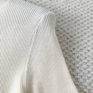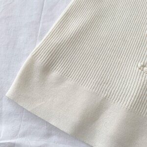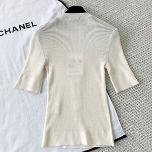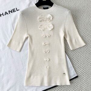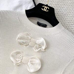 This white mid-sleeve knit top from Chanel is crafted with delicate ribbed knitwork, presenting a clean yet sophisticated texture. The bodice is adorned with multi-layered dimensional bows and the brand's iconic double C elements, arranged in a cleverly designed gradient from large to small. This design embodies Chanel's signature timeless elegance while adding a touch of youthful sweetness and playfulness.