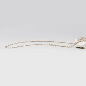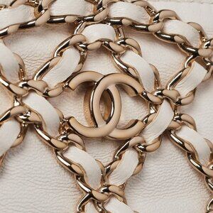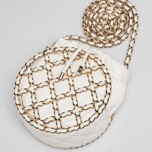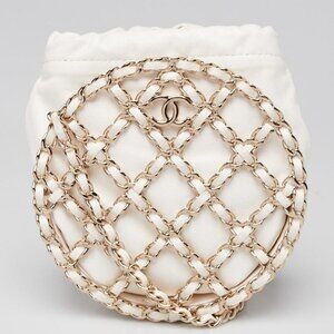 This chic little crossbody from Chanel has our hearts fluttering! White lambskin leather is paired with a stament making metal and leather cage with CC emble front and center. Drawstring closure and a long shoulder strap makes this a perfect bag for a night on the town! Retail price is $4725.