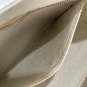 Chanel Tote By Karl Lagerfeld. Vintage. White. Interlocking CC Logo, Caviar Leather & Quilted Pattern. Gold-Tone Hardware. Rolled Handles & Dual Shoulder Straps. Chain-Link Accents & Single Exterior Pocket. Leather Lining & Dual Interior Pockets. This preloved bag has lots of life left in her but definitely shows signs of wear and use. Zip closure at top. There are minor scuffs on corners. Inside shows signs of wear and use. Look carefully at photos prior to buying this preloved bag.
