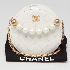 Chanel White Quilted Lambskin Leather Pearl Round Clutch with Chain Bag