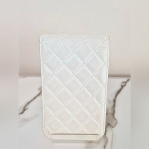 Pre-loved Chanel quilted leather phone holder crossbody bag in elegant white with silver-tone hardware. Features the iconic CC logo flap closure and a long leather-woven chain strap with charm details. Perfect compact size to carry your phone and essentials in timeless Chanel style.