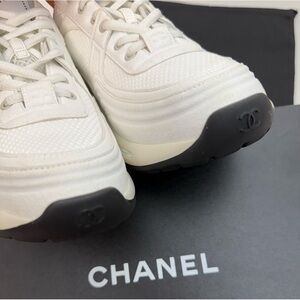 Chanel white sneakers with black accents. Stylish and comfortable.