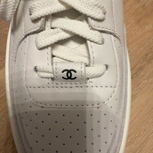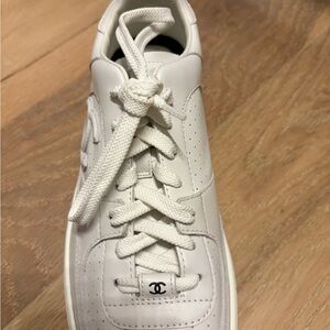Elegant CHANEL sneakers in ivory leather. Features signature logo on the side.