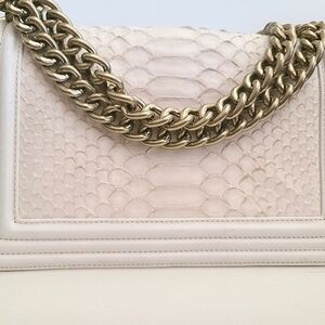 Elevate your style with this elegant Chanel shoulder bag. Featuring a luxurious white exterior and striking gold chain accents, this bag is perfect for any occasion. Experience timeless fashion with Chanel.