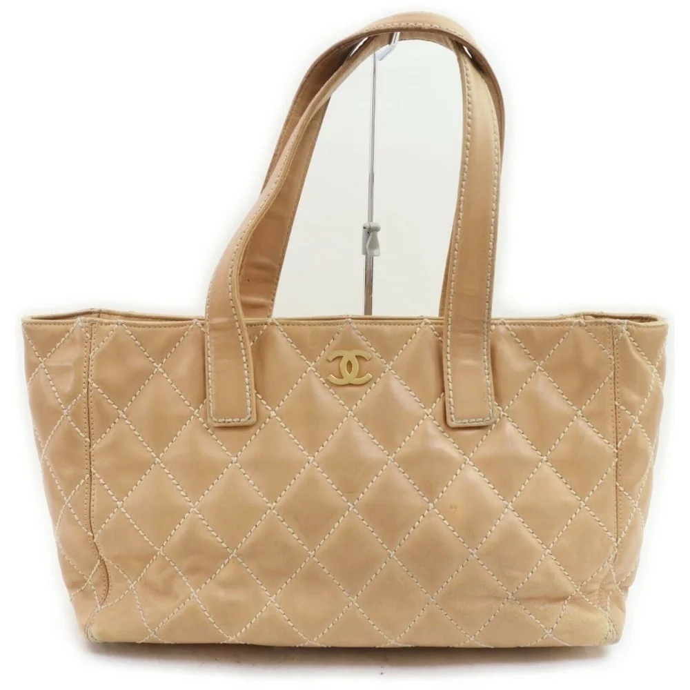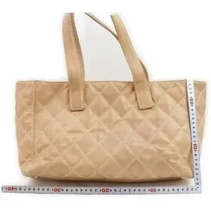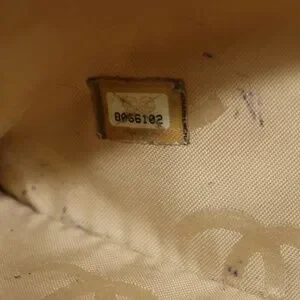 Two interior zip compartments. Interior is Chanel logo tan satin.