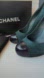 Elegant Chanel pumps in a stunning teal and black combination. Perfect for adding a touch of luxury to any outfit.